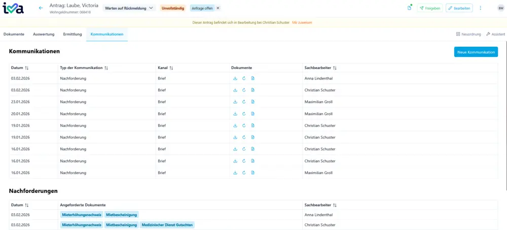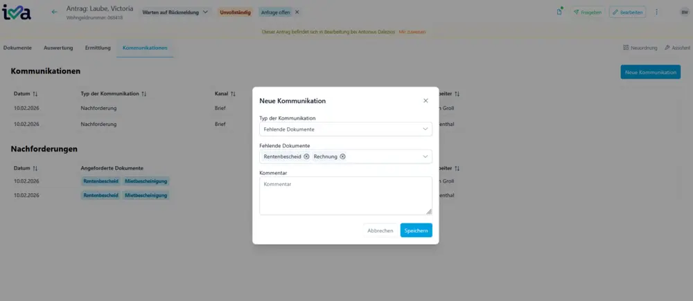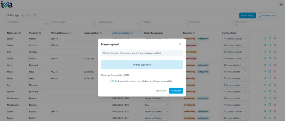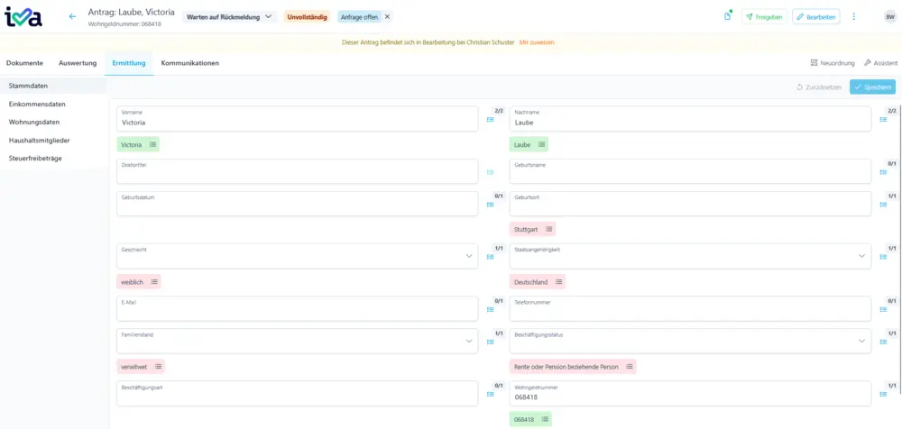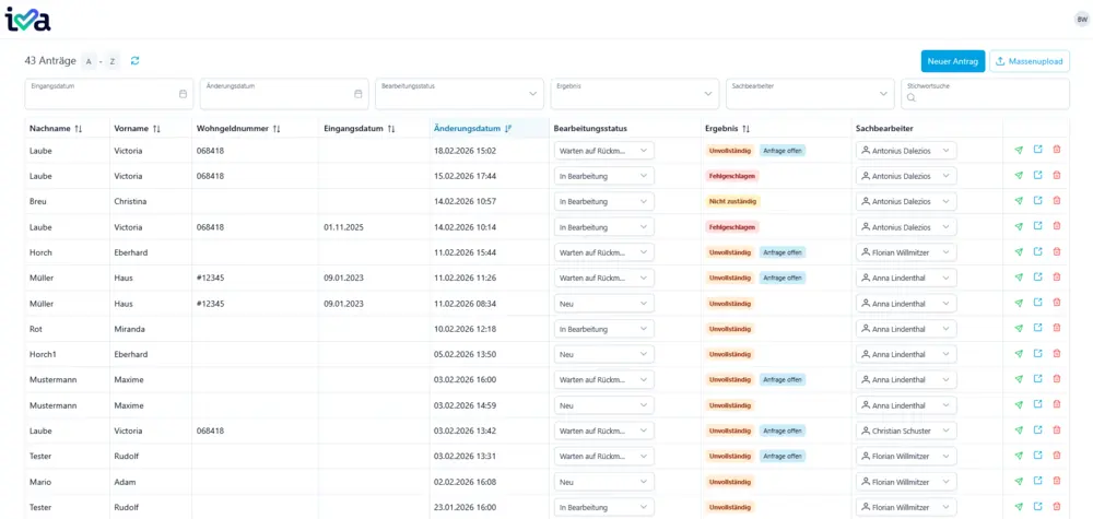 Dank optimierter Prozesse und gezieltem Einsatz von iva wird der bestehende Rückstau an Papieranträgen zügig und zuverlässig abgearbeitet, sodass sich kein neuer Antragsstau mehr aufbauen kann. - Sachbearbeitende-Benutzeroberfläche: