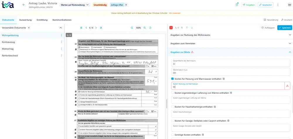 Mit unserer KI-gestützten Anwendung wird die Wohngeldantragsbearbeitung für den Sachbearbeiter radikal vereinfacht: