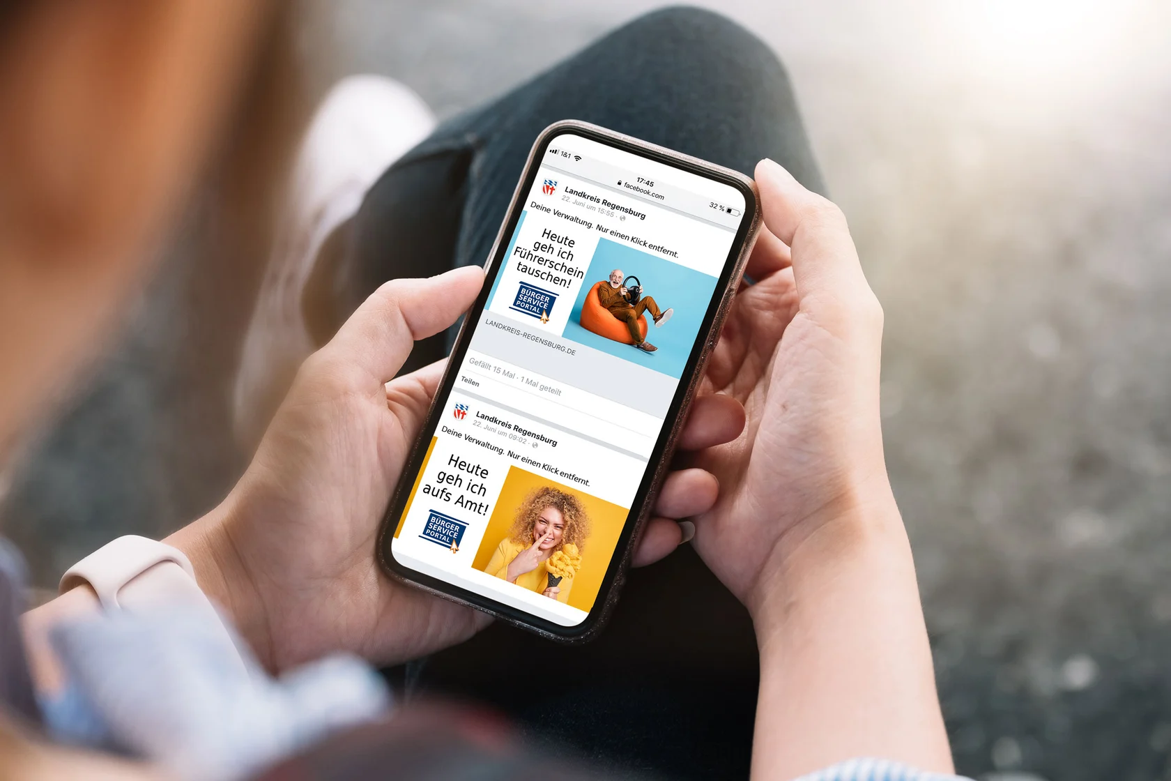 Text in der Anzeige: Du hast gerade keine Zeit, ins Landratsamt zu gehen? Tu‘s doch, wann‘s Dir passt: Von daheim oder von unterwegs. Auch am Wochenende. Und zu jeder Tageszeit. Klick Dich einfach ins Amt! Auf der Website Deiner Verwaltung.