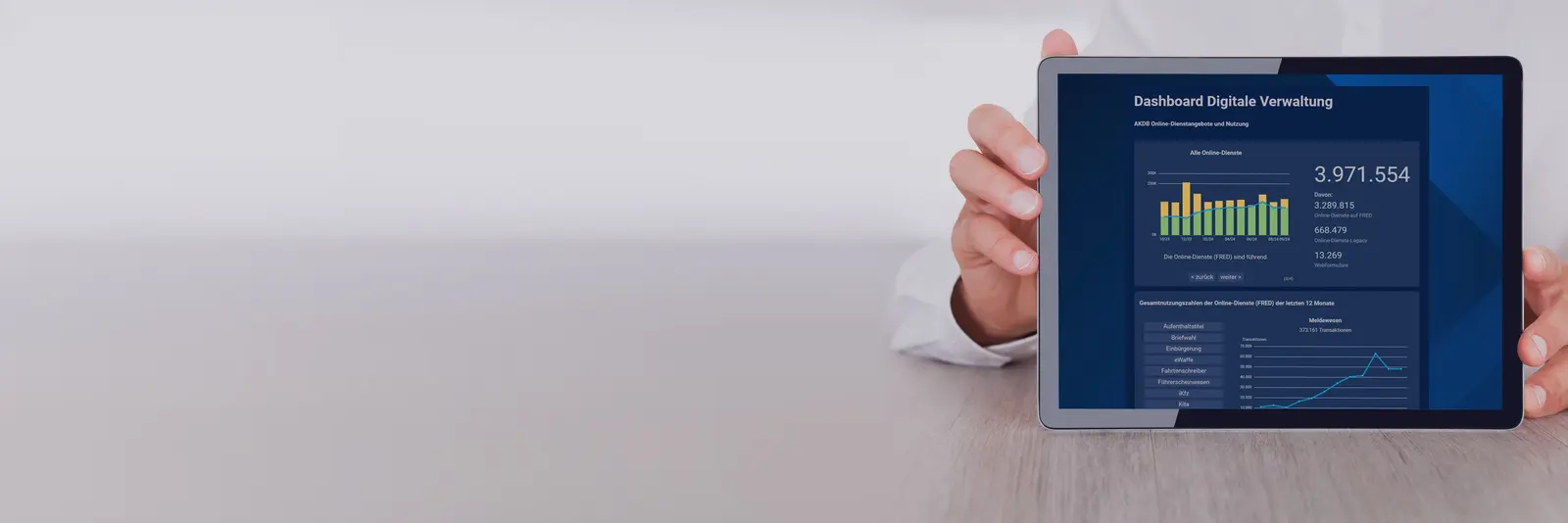 Auf unserem Dashboard Digitale Verwaltung stellen wir einige Kennzahlen zur Verfügung, die den Fortschritt des Angebots und der Nutzung digitaler Verwaltungsservices aufzeigen. Die Zahlen werden monatlich aktualisiert. Kontextinformationen erhalten Sie über eingeblendete Tooltips.