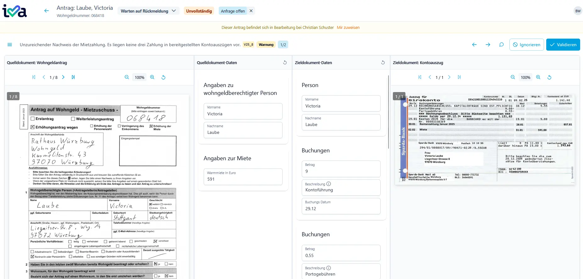 Iva prüft Anträge und Nachweisdokumente automatisch auf Vollständigkeit und Konsistenz, gibt verständliches Feedback, erstellt einen strukturierten „digitalen Zwilling“ des Antrags und unterstützt so sowohl Antragstellende als auch die Verwaltung effizient im gesamten Prozess.