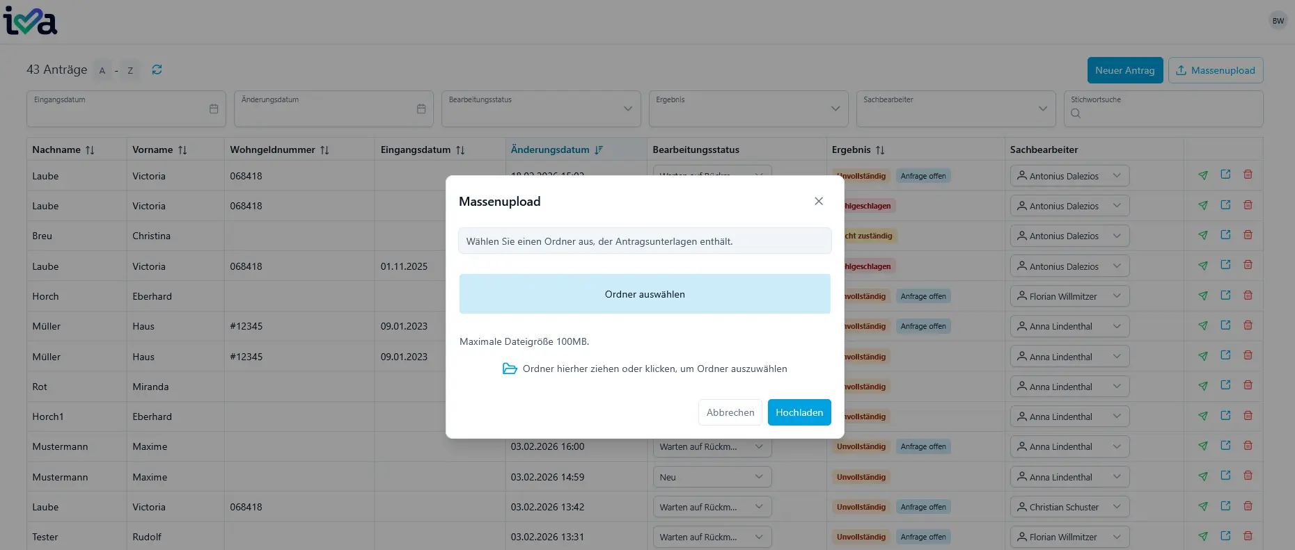 Dank optimierter Prozesse und gezieltem Einsatz von iva wird der bestehende Rückstau an Papieranträgen zügig und zuverlässig abgearbeitet. Dies sorgt auch ebenfalls auch dafür, dass sich kein neuer Antragsstau mehr aufbaut. - Sachbearbeiter-Benutzeroberfläche: