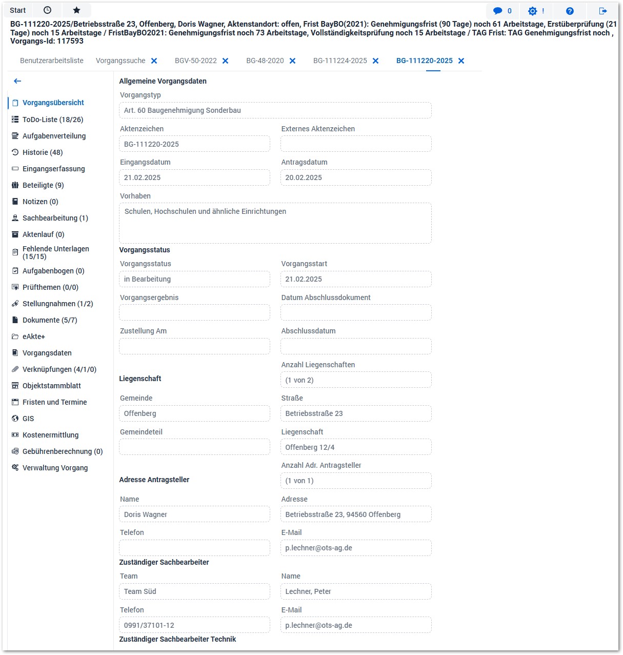 Vorgangsübersicht mit Modulleiste am Beispiel Sonderbau in OTS.Bau