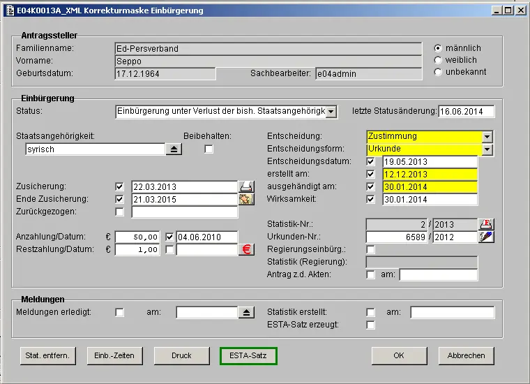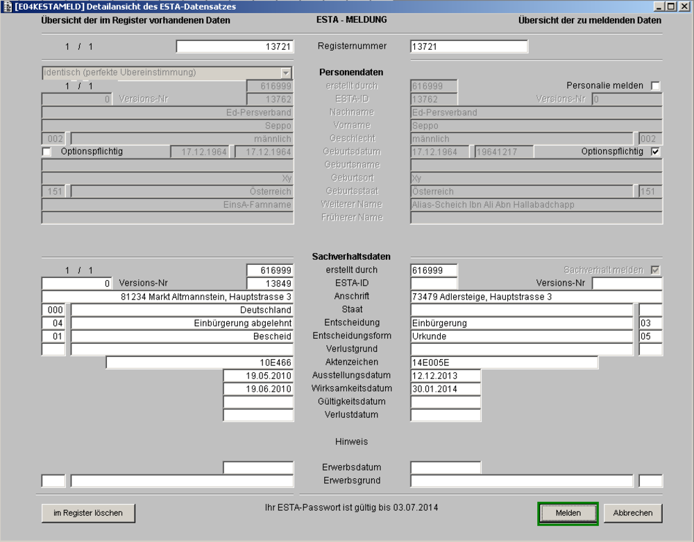 Beim Abschluss eines Antragsverfahrens zur Einbürgerung können die in EinsA gespeicherten Daten zur Person und zum meldepflichtigen Sachverhalt an das EStA-Register gemeldet werden. Dabei erfolgt ein dialoggeführter Abgleich mit den bereits im Register gespeicherten Datensätzen.