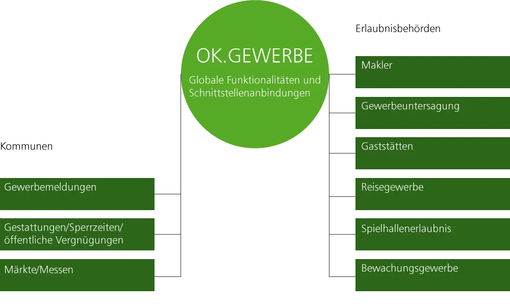 Das neue Verfahren OK.GEWERBE bietet alle Funktionalitäten für die Sachbearbeitung im Gewerbeamt, wie Gewerbean-, ab- und ummeldung, Gestattung und Sperrzeitänderung sowie die Bearbeitung der erlaubnispflichtigen Tätigkeiten für Genehmigungsbehörden.