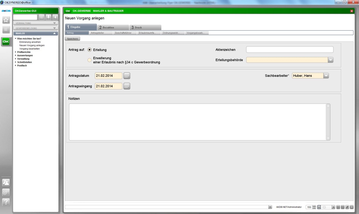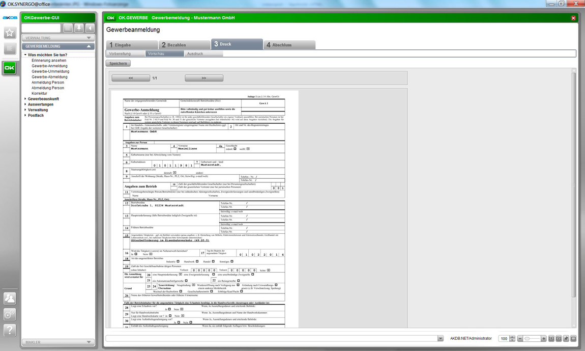 Das Verfahren OK.GEWERBE bietet alle Funktionalitäten für die Sachbearbeitung im Gewerbeamt, wie Gewerbean-, ab- und ummeldung, Gestattung und Sperrzeitänderung sowie die Bearbeitung der erlaubnispflichtigen Tätigkeiten für Genehmigungsbehörden.