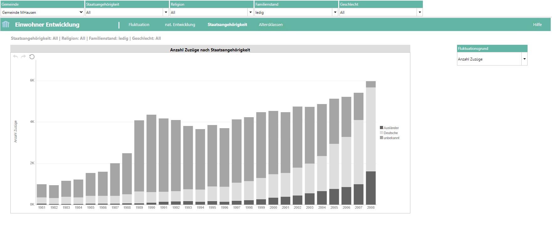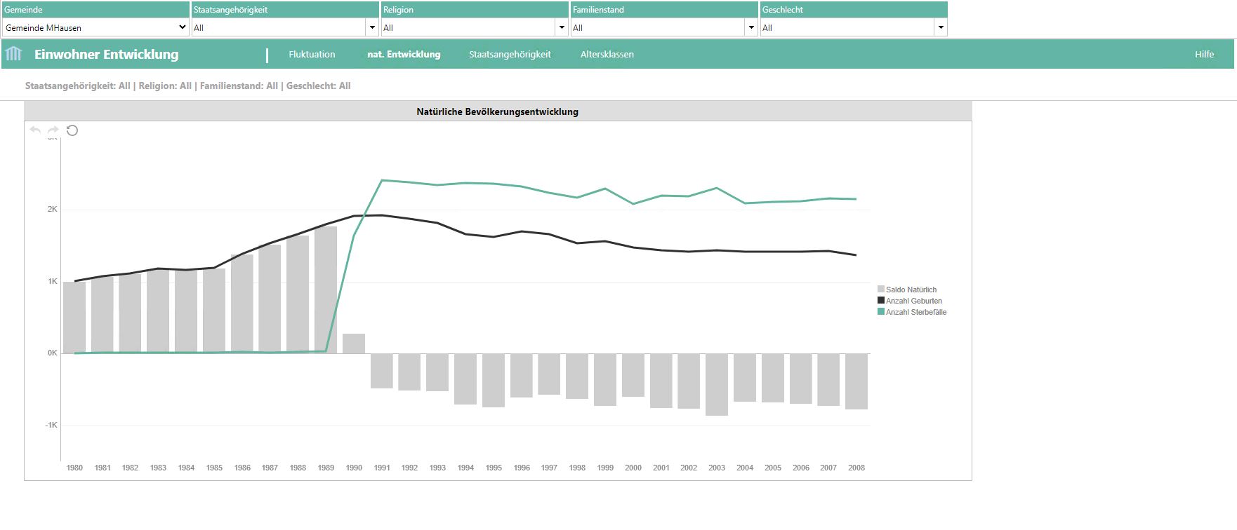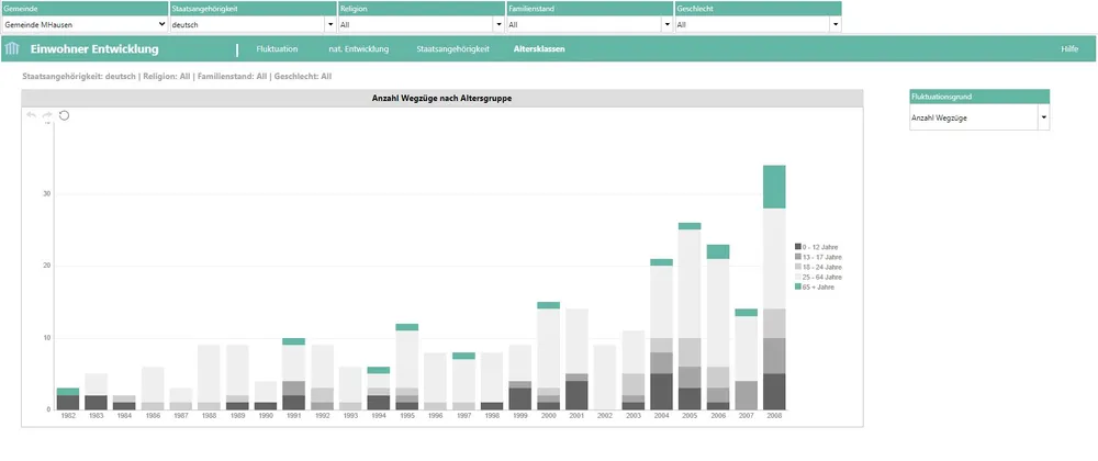 - Analyse von Zuzügen, Wegzügen, Geburten und Sterbefällen sowie der Verteilung und Entwicklung.