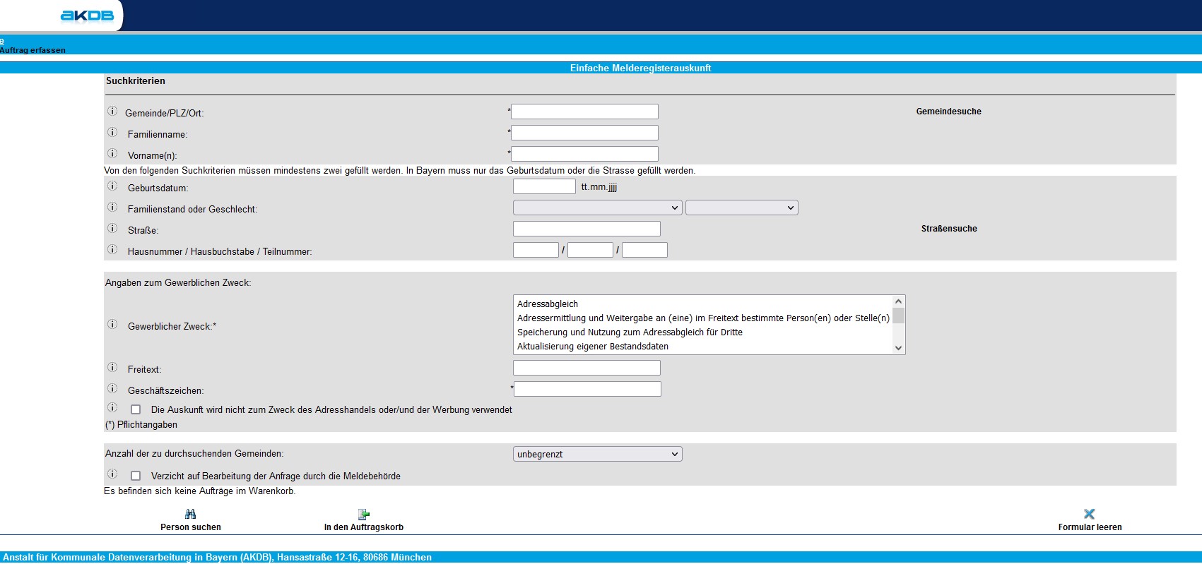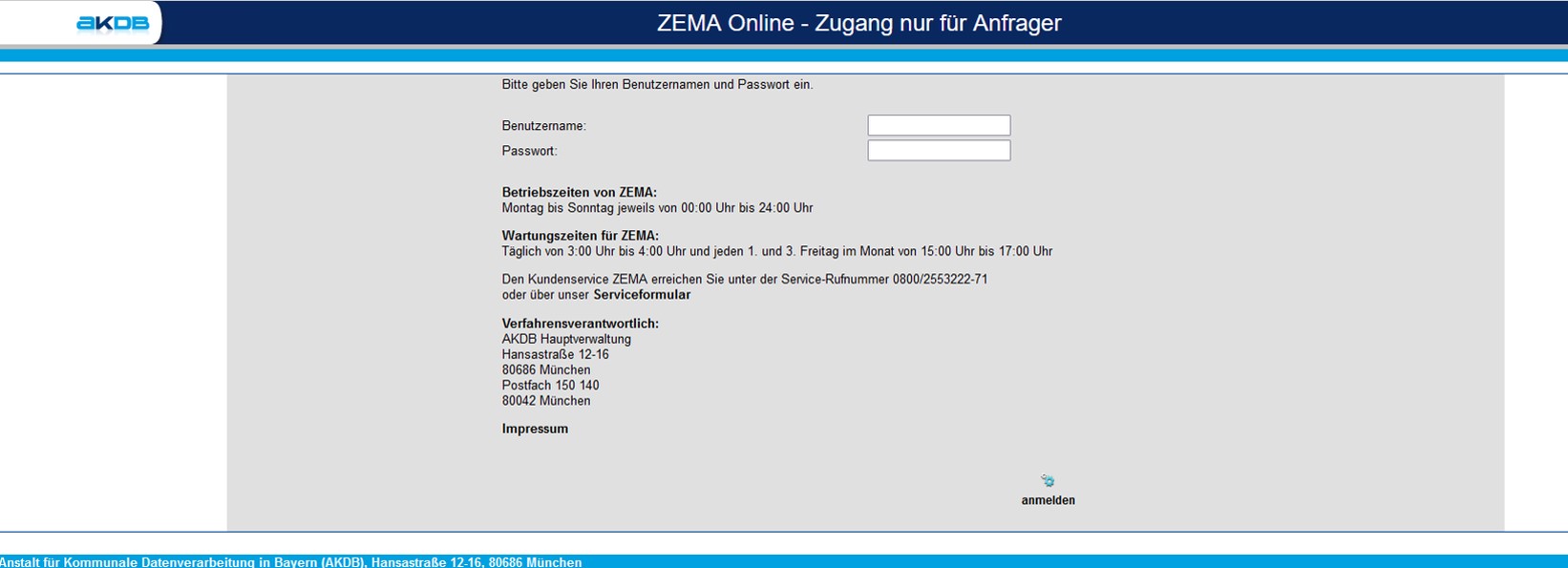 Mit dem Portal www.zemaonline.de steht der Privatwirtschaft eine Möglichkeit zur Verfügung, einfache Melderegisterauskünfte aus dem bei der AKDB geführten bayernweiten zentralen Einwohnerteildatenbestand einzuholen. Dieser Datenbestand ist durch die tägliche Übermittlung von Änderungen in den lokalen Melderegistern der Kommunen stets so tagesaktuell wie eine Abfrage direkt im Einwohnermeldeamt.
