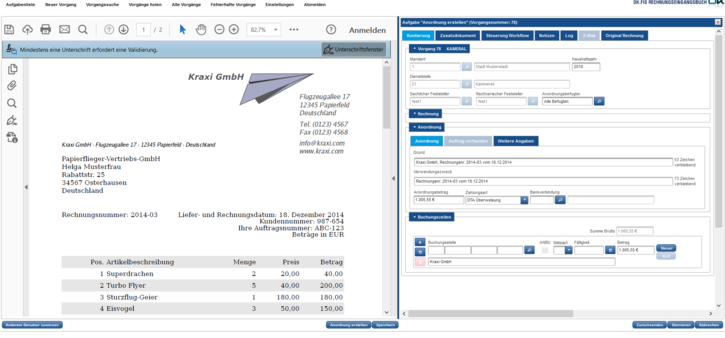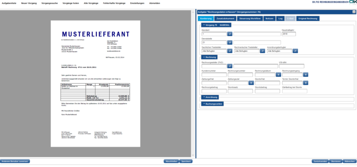 Anordnungsdaten werden ergänzt und die vollständigen Daten an OK.FIS übergeben. Die erfolgreiche Anordnungserstellung meldet OK.FIS an das elektronische Rechnungseingangsbuch zurück. Im Workflow steht der Vorgang für den nächsten Schritt bereit.