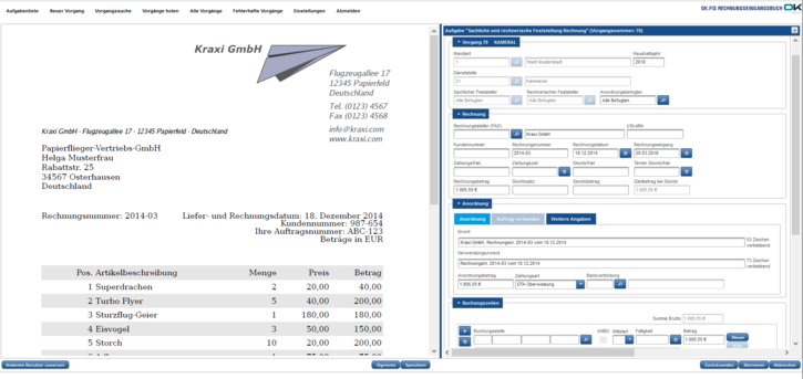 Rechnungsdaten können im elektronischen Rechnungseingangsbuch, soweit erforderlich, ergänzt werden. Daten aus elektronischen Rechnungen im ZUGFeRD-Format werden automatisiert in den Workflow übergeben. Sie stehen damit auch als Anordnungsdaten zur Verfügung – eine Doppelerfassung entfällt. E-Rechnungen in sonstigen PDF-Formaten werden als Bilddatei zur weiteren Verarbeitung bereitgestellt.