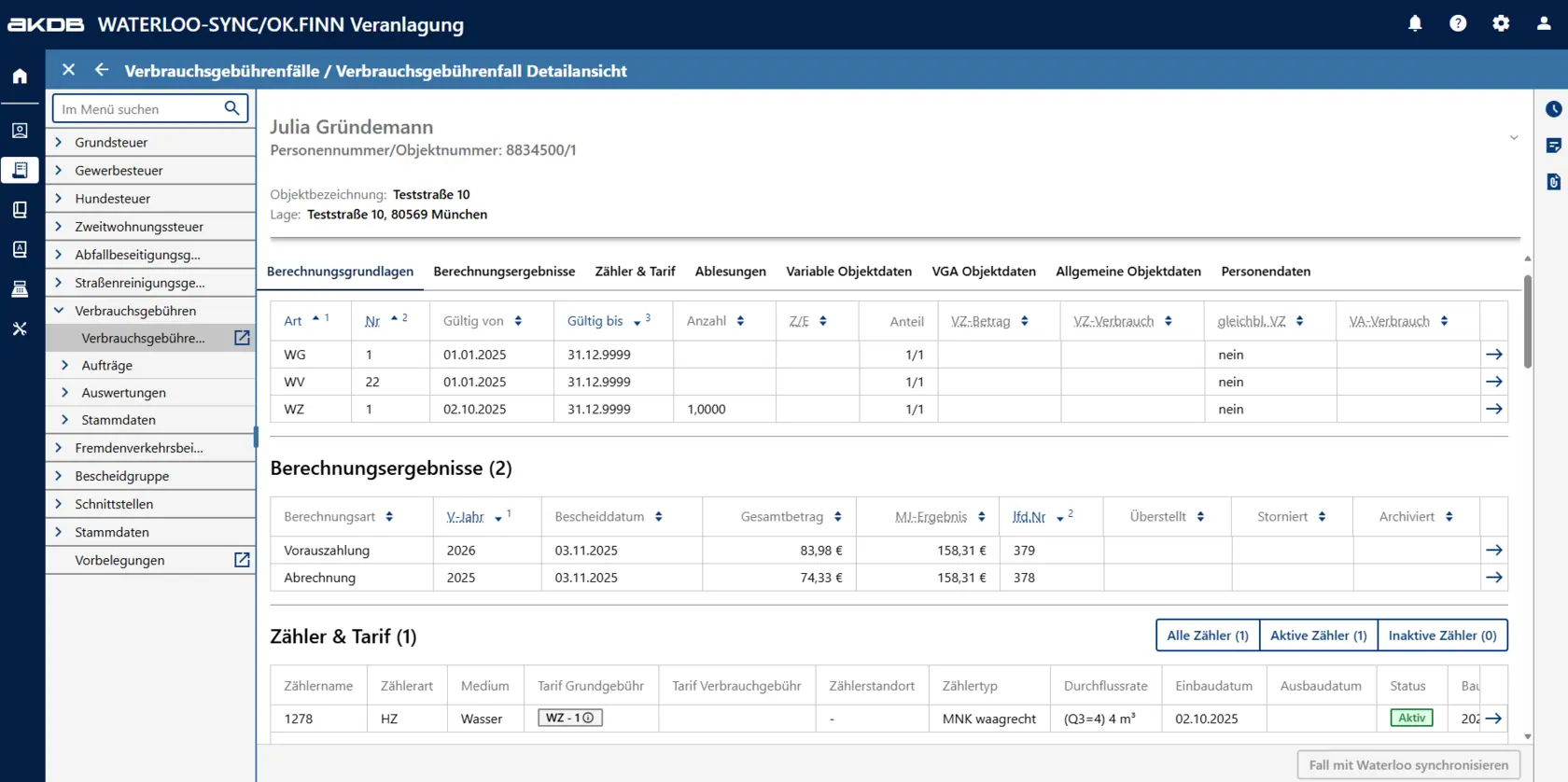 Mit den OK.FINN-Verbrauchsgebühren können alle Aufgaben im Zusammenhang mit der Vorauszahlung und Veranlagung von Verbrauchsgebühren erledigt werden. Alle Verbrauchsgebührenarten, z.B. Wasser und Abwasser können unter Berücksichtigung der geltenden Satzungen einfach festgesetzt werden. Durch die Live-Schnittstelle für Zähler- und Ablesedaten zum vorgeschalteten Wasserzählermanagement genießen Sie einen nahtlosen Datenaustausch.