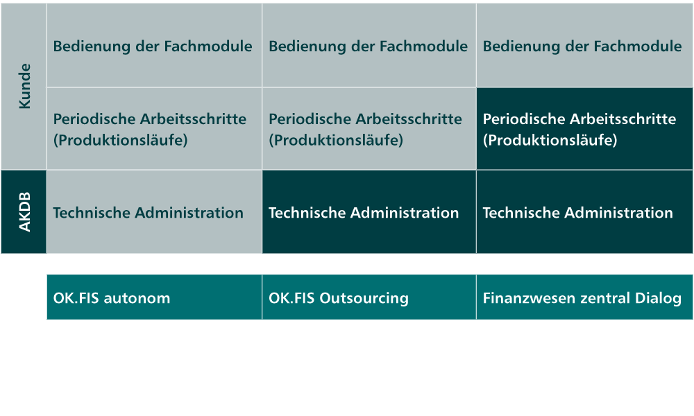 Im Outsourcingbetrieb übernimmt die AKDB die systemtechnische Betreuung für den Kunden. Das Verfahren ist in unserem Rechenzentrum installiert. Der Kunde partizipiert an der Sicherheit und Zuverlässigkeit eines BSI-zertifizierten Betriebs. Neue Verfahrensstände und sonstige Updates werden von uns für den Kunden durchgeführt. Für die Bedienung des Verfahrens ist der Kunde in vollem Umfang selbst verantwortlich. Die Planung, Definition und Ausführung von periodischen Arbeitsschritten (z. B. Bankabbuchungen, Überweisungen, Forderungsüberwachungsläufe) erfolgt durch den Kunden selbst.
