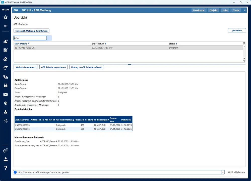 - Meldung der Leistungsdaten an das AZR erfolgt direkt aus dem Fachverfahren.