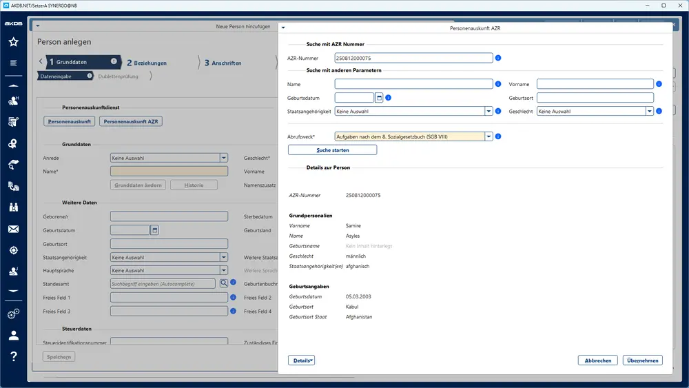 - Übernahme von Personendaten vom AZR erfolgt direkt in das Fachverfahren.