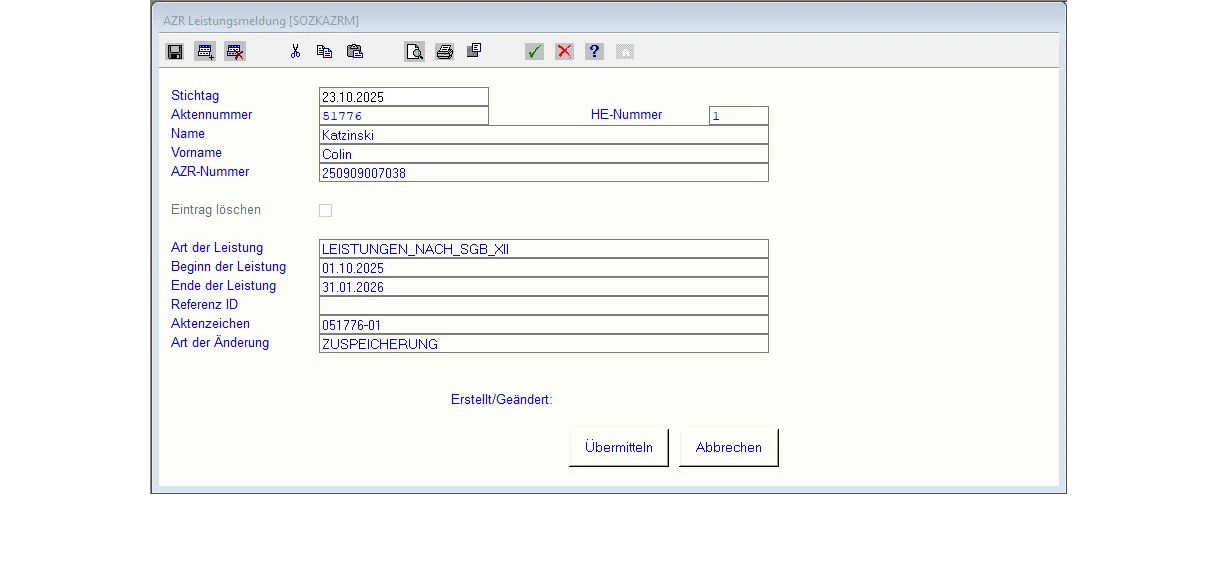 - Pro Fall werden neue und geänderte Leistungsdaten per Klick an das AZR gemeldet.