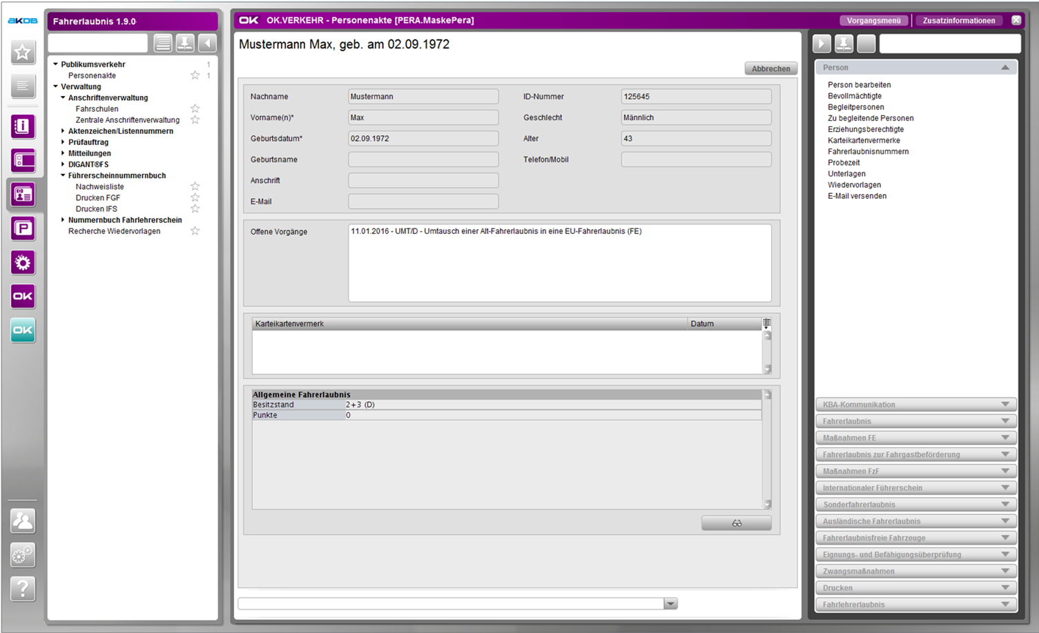 Ein Verfahren, das alles kann. Vorgänge aus dem Bereich Zulassungswesen und Führerscheinwesen werden übersichtlich und thematisch passend dargestellt. Logisch aufeinander aufgebaut sorgen sie für eine schnelle und effiziente Bearbeitung und optimieren so Ihre Arbeitsabläufe.