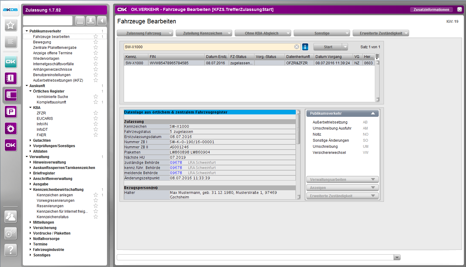 Die neue javabasierende Software, in die die langjährigen Erfahrungen aus OK.VORFAHRT und OK.EFA eingeflossen sind, wurde hinsichtlich Bedienbarkeit und interaktiven Prüfungen optimiert, um Sachbearbeiter und Fachkräfte bei der Abwicklung der oftmals komplexen Zulassungsvorgänge zu unterstützen.