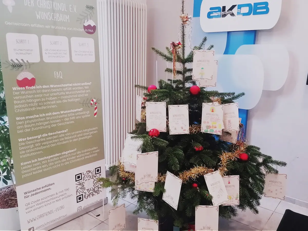 In jedem Advent steht im Eingangsbereich der Münchner AKDB-Hauptverwaltung ein geschmückter Lebend-Wunschbaum, der nach der Aktion wieder eingepflanzt wird. An den Zweigen hängen 50 Wunschzettel von Kindern aus bedürftigen Familien. Die Wünsche waren in diesem Jahr schon innerhalb weniger Tage von AKDB- Mitarbeiterinnen und -Mitarbeitern erfüllt. Den Kauf eines konkreten Kinderwunsches erledigen die Vereinsmitglieder von Christkindl e.V.