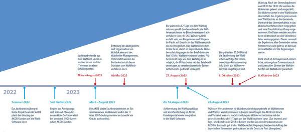Am 8. Oktober 2023 wird der 19. Bayerische Landtag gewählt. Die über neun Millionen Wahlberechtigten im größten deutschen Bundesland dürfen bei der Wahl die Abgeordneten im Landtag sowie in den jeweiligen Bezirkstagen für die nächste Legislaturperiode von fünf Jahren bestimmen. Für die AKDB hat die Wahl schon längst angefangen: Seit Herbst 2022 wurde bei den bayerischen AKDB-Kunden die Wahl-Software elect ausgerollt. Sie unterstützt die Ämter von der Vorbereitung über die Durchführung der Wahl bis hin zu den Auswertungen der Wahlergebnisse. Auch in den Einwohnermeldeämtern laufen die Vorbereitungen für die Erstellung des Wählerverzeichnisses und den Versand der Wahlbenachrichtigungen. Ein Zeitstrahl zeigt, was alles im Vorfeld der Wahl geschieht.