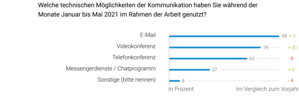 Von den technischen Neuerungen, die die Pandemie in die Verwaltung gebracht hat, ist die Videokonferenz diejenige, die den größten Zuwachs verzeichnen konnte. Waren es bei der ersten Befragung 38 % der Beschäftigten, die Videokonferenzen nutzten, sind es mittlerweile mehr als 79 %. Blickt man zudem auf die Studie aus dem vergangenen Jahr, gaben damals lediglich 17 Prozent der Befragten an, dass sie vor der Pandemie bereits Videokonferenzen genutzt haben – eine Steigerung von 62 Prozentpunkten! Auch die Messengerdienste gewinnen an Zuspruch und steigen von 32 % auf 37 %. Die Videokonferenz war auf Kommunalebene am weitesten verbreitet (89 %). Auf Bundesebene nutzen sie 82 % und auf Landesebene 73 % der Beschäftigten.