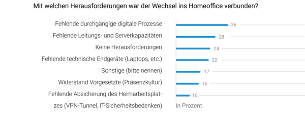 92 Prozent der Beschäftigten in Verwaltungen, deren Jobs grundsätzlich dafür geeignet sind, möchten zukünftig (auch) im Homeoffice arbeiten. Zwar hat sich die Zahl der mehrheitlich im Homeoffice arbeitenden Beschäftigten leicht erhöht, jedoch waren 2020 rund ein Drittel durchgängig im Homeoffice, während es im Frühjahr 2021 nur noch ein Viertel der Beschäftigten waren. Einer der Hauptgründe: Es fehlen durchgängige digitale Prozesse, etwa digitale Dokumentenmanagementsysteme bzw. E-Akten.
