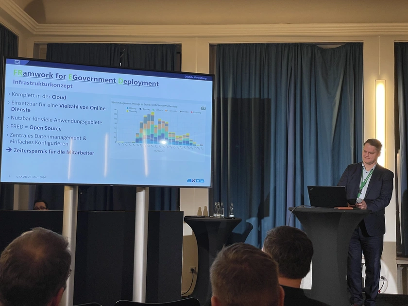 Eine Erfolgsgeschichte der deutschen Digitallandschaft präsentierten Markus Keller und Alexander Gerlach von der AKDB. Sie erläuterten FRED, das Framework for E-Government Deployment. Es handelt sich um eine Betriebs- und Management-Plattform für Online-Dienste. Mit FRED werden diese konfiguriert, getestet, in kommunale Webseiten integriert, gemanagt und Nutzungsstatistiken erstellt. Das ist ein erster Schritt in Richtung Standardisierung, denn die Online-Dienste, die die AKDB über FRED ausrollt, sind unter anderem nach Open-Source-Kriterien entwickelt und erlaubten größtenteils Ende-zu-Ende digitale Prozesse. Das Besondere an FRED ist außerdem die Möglichkeit, Echtzeit-Feedback von Nutzenden zu registrieren und zu visualisieren.