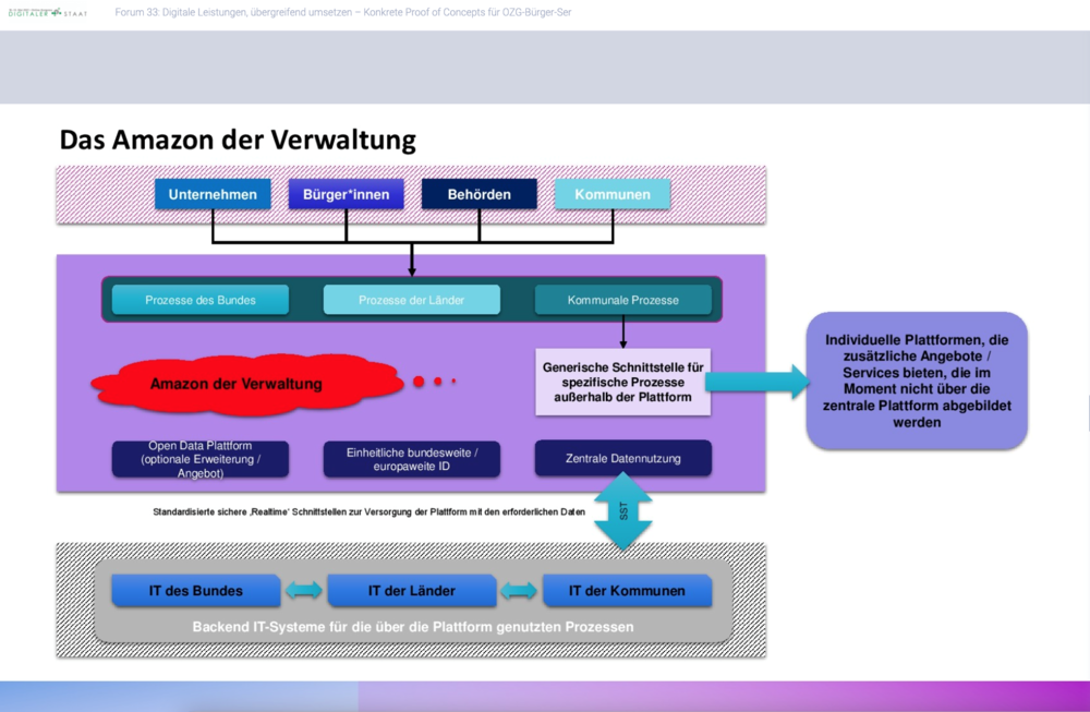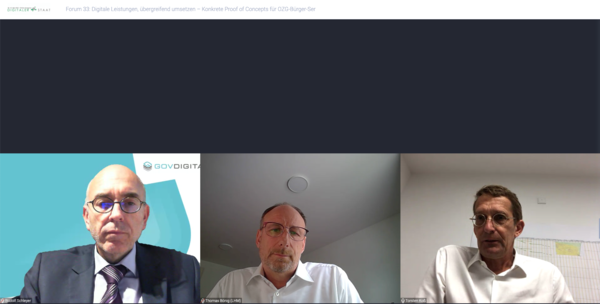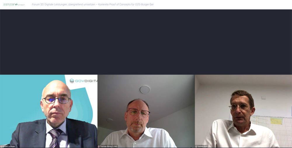 Dass beim Thema „EfA“ mittlerweile handfeste Fragen in den Mittelpunkt rücken, wurde auch in den Zuschauer-Fragen im Chat deutlich: Dort wurden vermehrt Sicherheitsaspekte sowie konkrete Kosten- und Umsetzungsfragen thematisiert. Diesen geforderten Pragmatismus brachte Thomas Bönig mit in die Diskussion. Als Leiter des Referats für Informations- und Telekommunikationstechnik der Landeshauptstadt München lieferte er einen Perspektivwechsel hin zur Sicht der Kommunen. Dabei wurde er sehr deutlich: Sein Traum sieht ein „Amazon für Verwaltungen“ vor; eine vom Staat gelieferte Plattform, die den Kommunen zentral alle EfA-Dienste zur Verfügung stellt. Der AKDB-Vorstandsvorsitzende und govdigital-Vorstand Rudolf Schleyer führte in seinen Schlussworten Bönigs Pragmatismus fort: „Meine Hoffnung ruht tatsächlich auf diesen Proofs of Concepts, auf diesen verschiedenen Methoden: Wir werden ausprobieren, was da am besten funktioniert.“