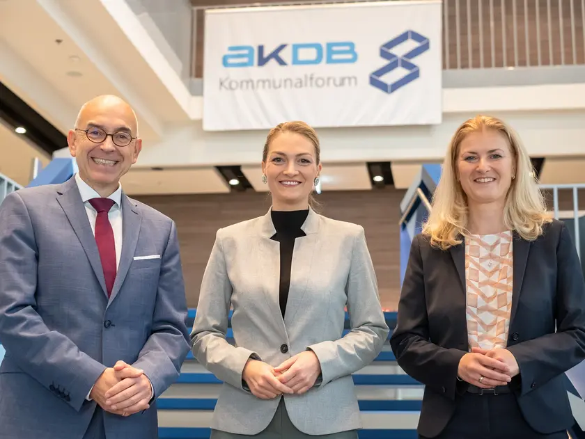 Judith Gerlach, Bayerische Staatsministerin für Digitales (Mitte), mit dem AKDB-Vorstandsvorsitzenden Rudolf Schleyer und Vorstandsmitglied Gudrun Aschenbrenner.