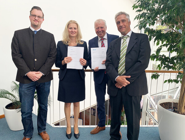 Der Dozent für Öffentliche Betriebswirtschaftslehre und Haushaltswesen in der Kommunalverwaltung Martin Pirner, AKDB-Vorstandsmitglied Gudrun Aschenbrenner, der Leiter des Fachbereiches Allgemeine Innere Verwaltung, Direktor Harald Wilhelm, sowie Dr. Markus Ludwig, Leiter der Stabsstelle Hochschulkooperation bei der AKDB, unterschrieben den Vertrag in den Räumlichkeiten der Hochschule.