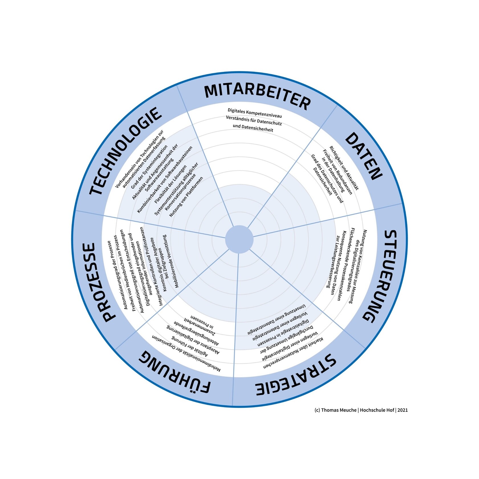 Also lag es nahe, Kräfte zu bündeln. Gemeinsam entwickeln die Hochschule Hof und die AKDB ein digitales Reifegradmodell, das die Verwaltungen dabei unterstützt, ihren Status Quo in Sachen Digitalisierung zu bestimmen und notwendige Maßnahmen zu identifizieren und umzusetzen. Und das, weit bevor Technik oder Software-Lösungen bereitgestellt werden. Das untenstehende Modell zeigt beispielhaft, wie die Organisation und Dokumentation von Prozessen in die Gesamtbetrachtung einfließen.