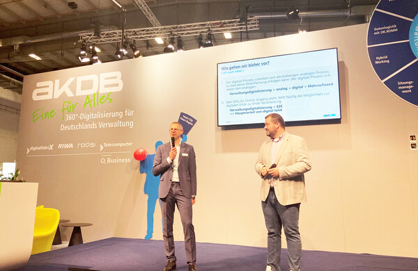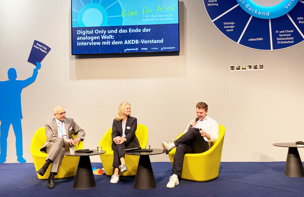 Dass die Bürger Ende-zu-Ende digitale Prozesse wollen, ist eine Binsenweisheit. Dass der Zugang zur Verwaltung in einigen Jahren für Bürger und Unternehmen ausschließlich digital sein soll (Digital Only), ist dagegen eine mutige Forderung, die die AKDB stark befürwortet. Das sei in Ländern wie Dänemark bereits gang und gäbe, so Gudrun Aschenbrenner. Wer Angst habe, digital abgehängt zu werden, für den müsse selbstverständlich Hilfe bereitgestellt werden. „Wir riskieren eine Krise unseres Rechtsstaats, wenn wir nicht digitalisieren und automatisieren“, so der AKDB-Vorstandsvorsitzende Rudolf Schleyer im Interview mit Digitaljournalist Matthias Punz auf der AKDB-Stage. Der Fachkräftemangel mache das Digital-Only-Konzept bald unabdingbar. „Bis 2023 werden wir eine zunehmende Automatisierung bei Verwaltungsvorgängen sehen. Auch der Ortsbezug wird sich verringern: Leistungen werden nicht mehr an eine Kommune gebunden sein. Das wird neue Zuständigkeiten in der föderalen Verwaltung hervorbringen.“