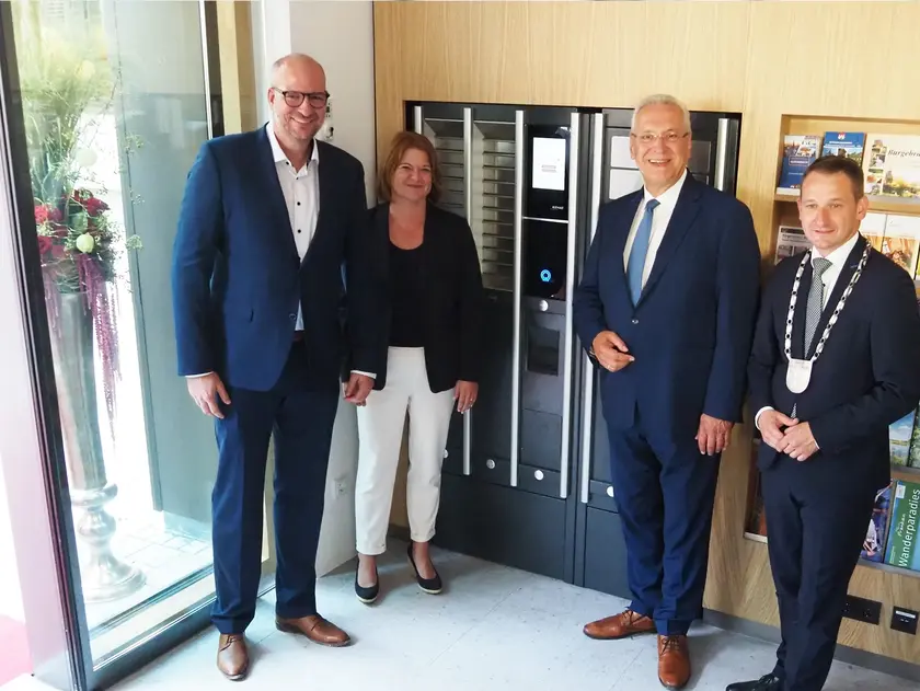Von l. n. r.: Christoph Schrenk und Stefanie Karmann (beide AKDB), der Bayerische Innenminister Joachim Herrmann und Johannes Maciejonczyk (Bürgermeister Burgebrach) vor der Bürgerservice-Box.