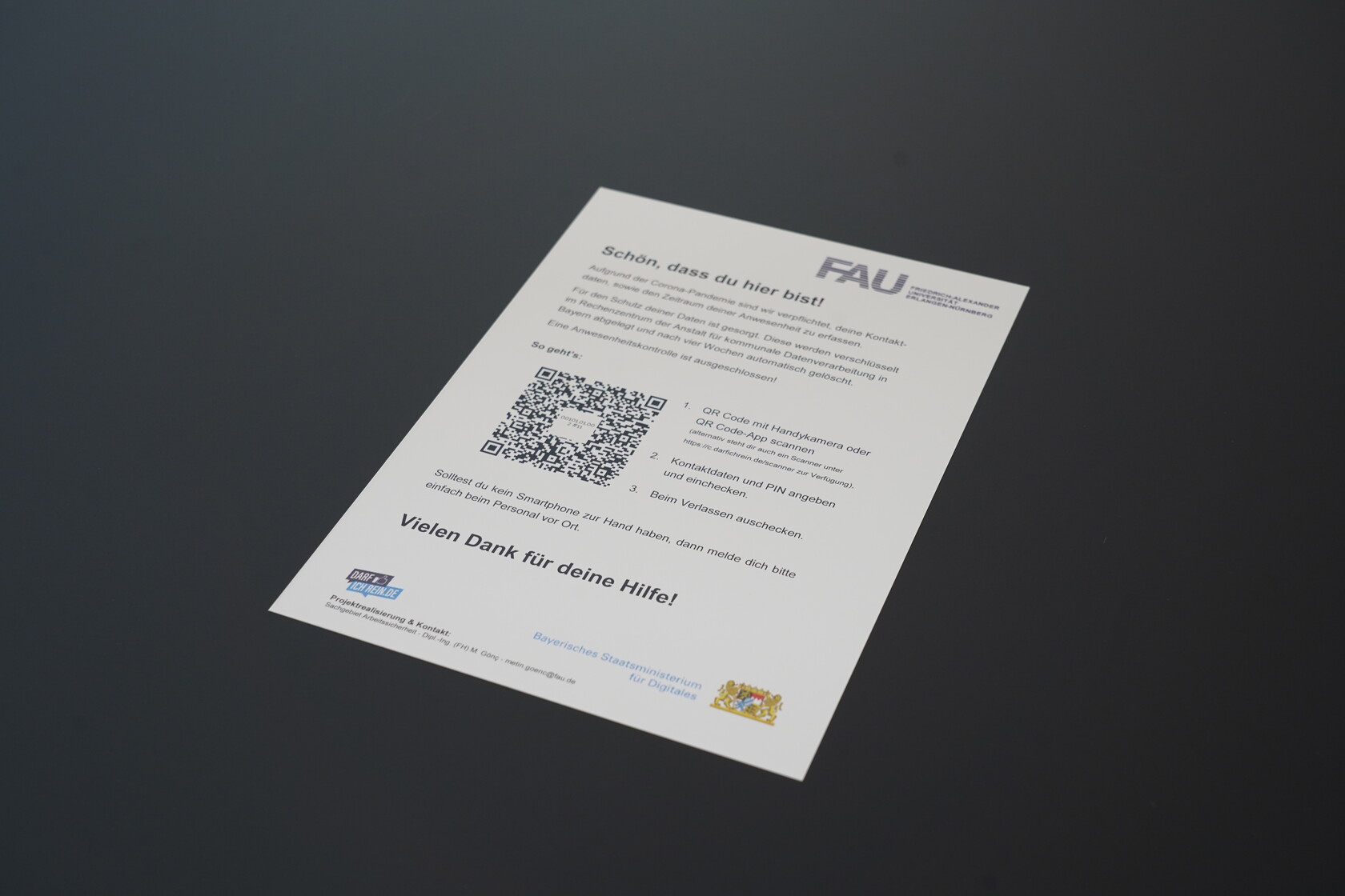 In den Lehrsälen der Friedrich-Alexander-Universität wurden dazu QR-Codes zur Registrierung angebracht. Die Studierenden scannen mit ihren Smartphones diesen QR-Code und können in einem sich öffnenden Formular ihre Kontaktdaten eingeben. Sie benötigen dafür keine extra App und müssen keine spezielle Software installieren. „Darfichrein“ ist ein gemeinsames Tochterunternehmen der Anstalt für Kommunale Datenverarbeitung in Bayern (AKDB) und des bayerischen Hotel- und Gastgeberverbands (DEHOGA).