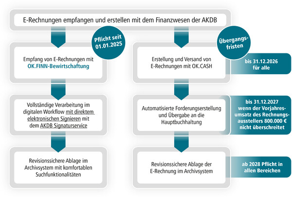 Der digitale Empfang von elektronischen Rechnungen ist seit 01.01.2025 auch für die öffentliche Verwaltung verpflichtend. Für die Ausstellung gibt es eine Übergangsfrist bis Ende 2026. E-Rechnungen bieten Kommunen dabei klare Vorteile: Sie erhöhen die Transparenz, minimieren Fehler und sparen Zeit. Von der Erzeugung bis zum Versand und vom Empfang hin zur Archivierung bewegen sich die Verwaltungen mit den Lösungen der AKDB durch einen vollständig digitalen Prozess.