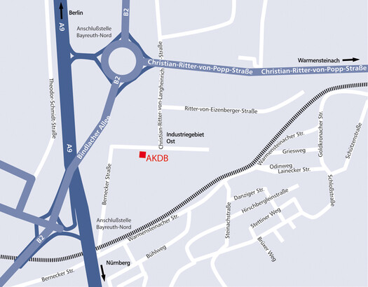 Ausfahrt Bayreuth-Nord / Warmensteinach: auf der linken Spur in den Kreisverkehr fahren, dort rechte Spur benutzen, zweite Ausfahrt Richtung Industriegebiet Ost, rechts einordnen, an der Ampel rechts abbiegen in die Christian-Ritter-von-Langheinrich-Straße